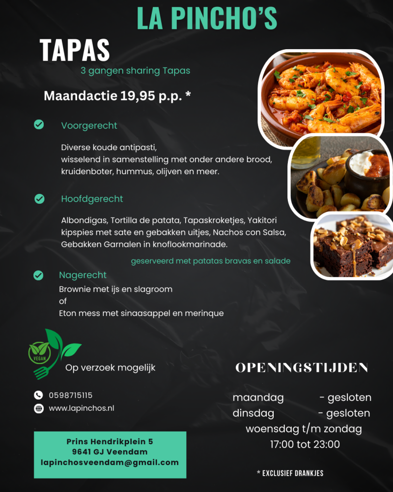 Kom in een gezelschap van minimaal nog 3 betalende gasten, dan trakteren wij je op een kosteloos Tapas arrangement t.w.v. €32,50 (Drankjes niet inbegrepen). Een feestelijke avond waar je met je gezelschap samen geniet van een heerlijke avond.